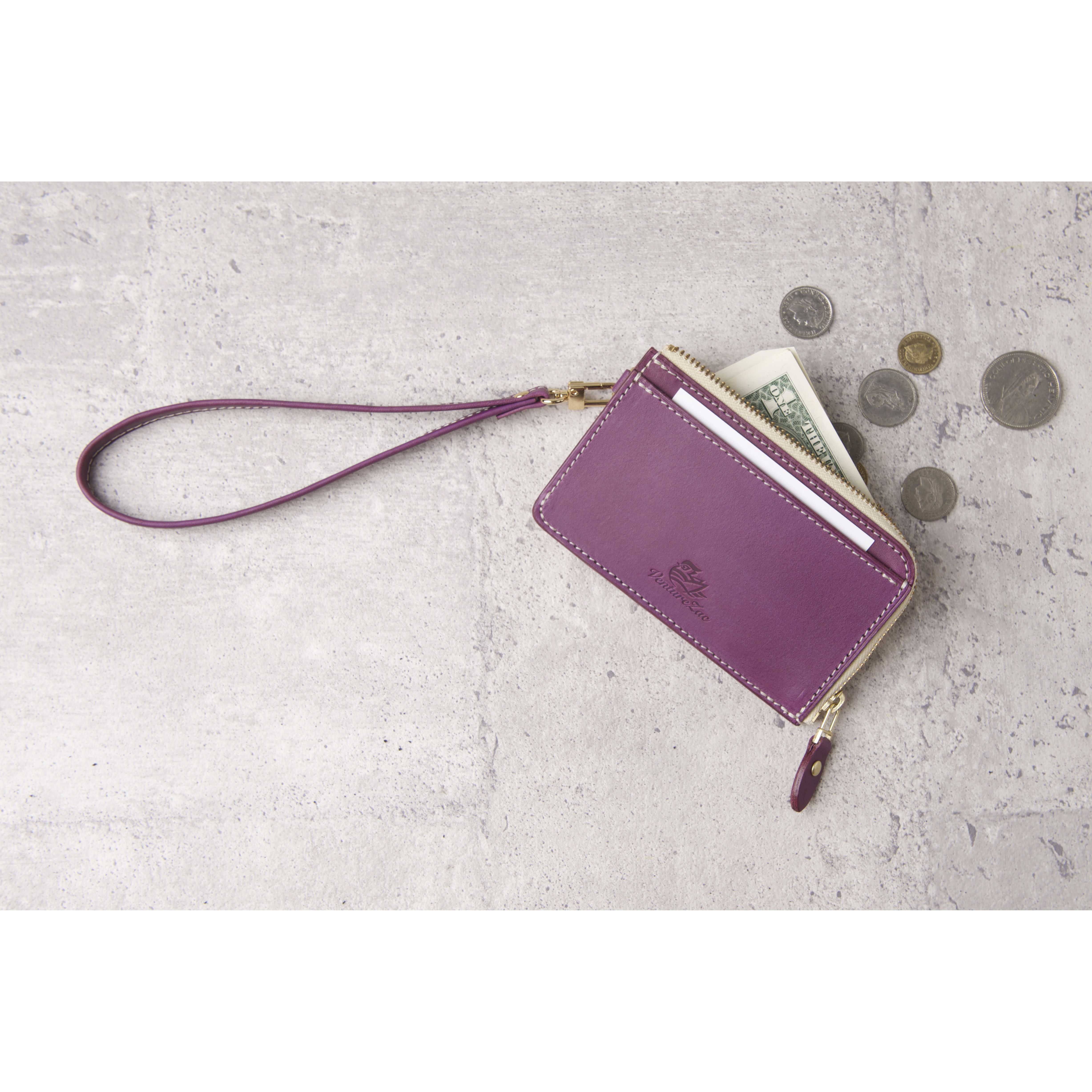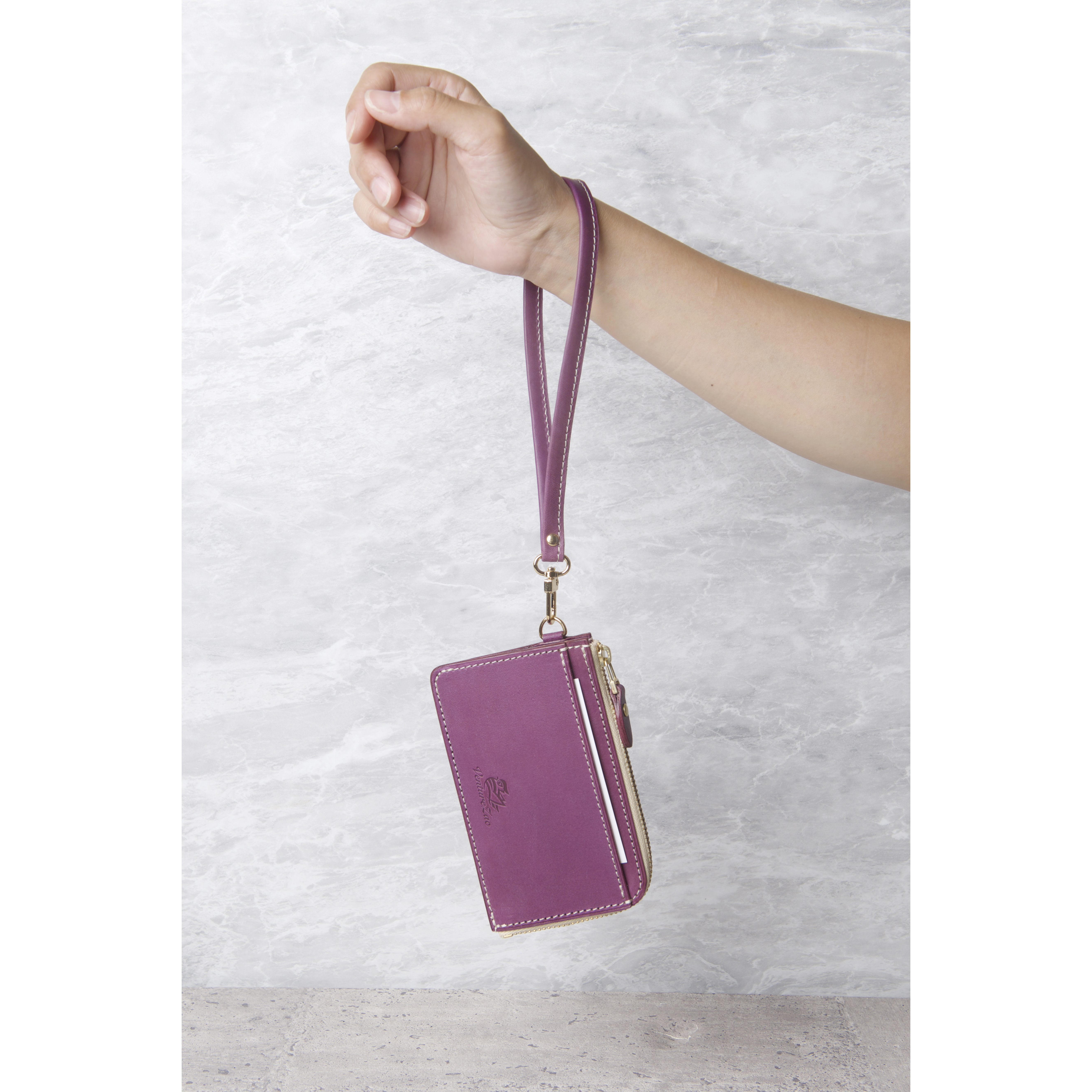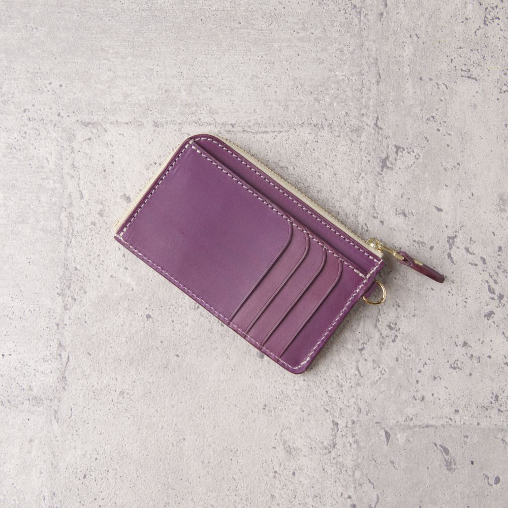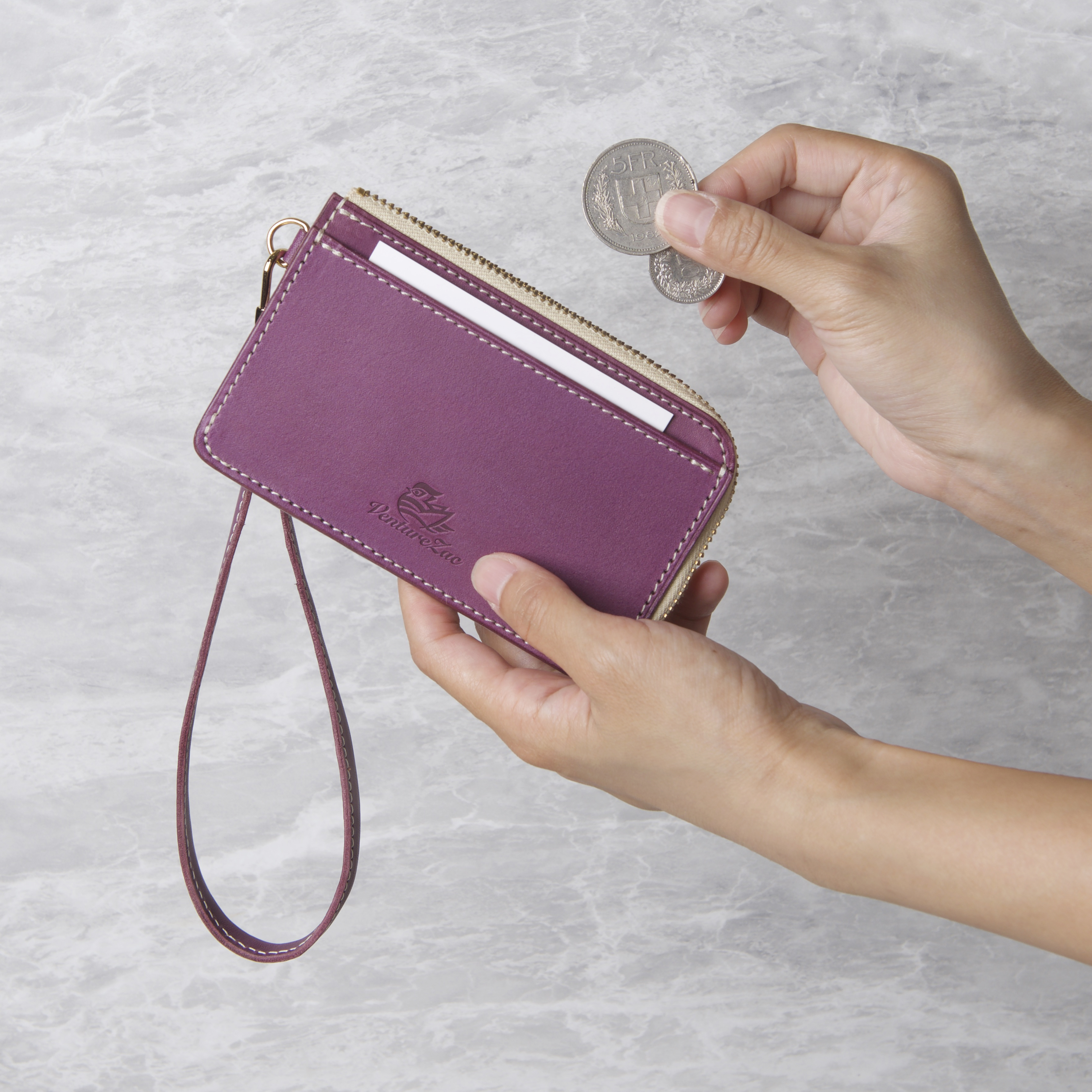 同時具有紅色熱情與藍色冷靜的紫色植鞣革,也讓人有尊貴、神秘的感覺,金色配件的搭配烘托紫色卡夾包的奢華感,讓人久久無法移開視線。以植物單寧酸鞣製成皮革,製作過程相當耗費工時,製成的皮革富有彈性與韌性,容易吸收油脂,同時帶有淡雅自然的香氣。