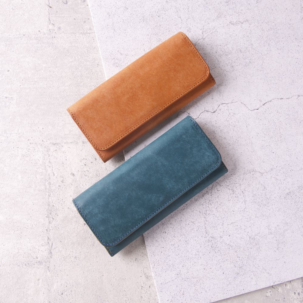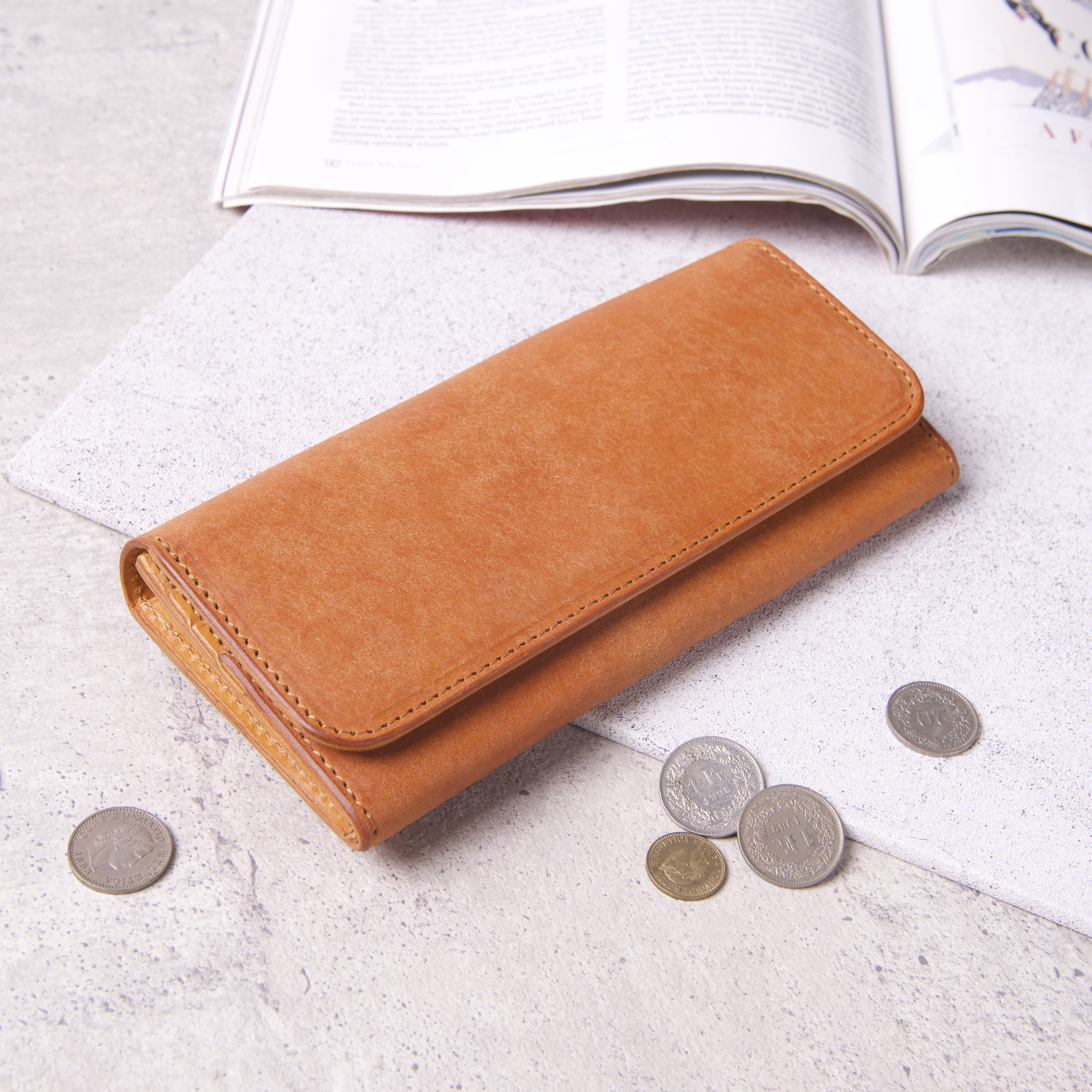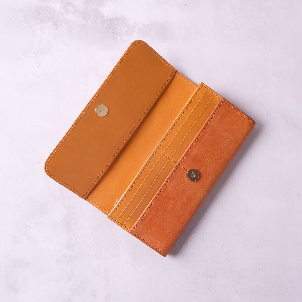 長夾以磨砂淺棕色植鞣革搭配杏黃色植鞣革,相近的二種色調展現出前所未有的溫柔調和感,磨砂淺棕植鞣革由外側延伸包覆至內側,讓長夾內側更顯立體質感。