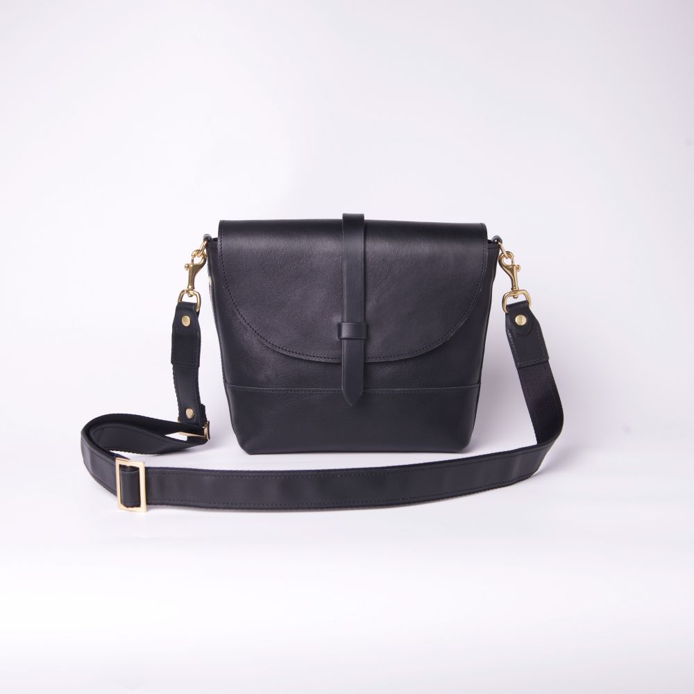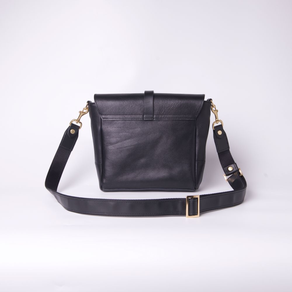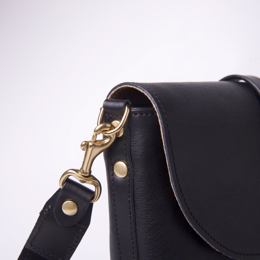 這款經典側背包採用全黑色的義大利軟植鞣革,設計上以弧形線條呈現簡潔獨特的包身造型,釦帶由包後延伸至前為側背包袋定義了主體精神,金色配件凸顯了全黑包身的高級感還自帶強氣場,造型百搭百看不厭。