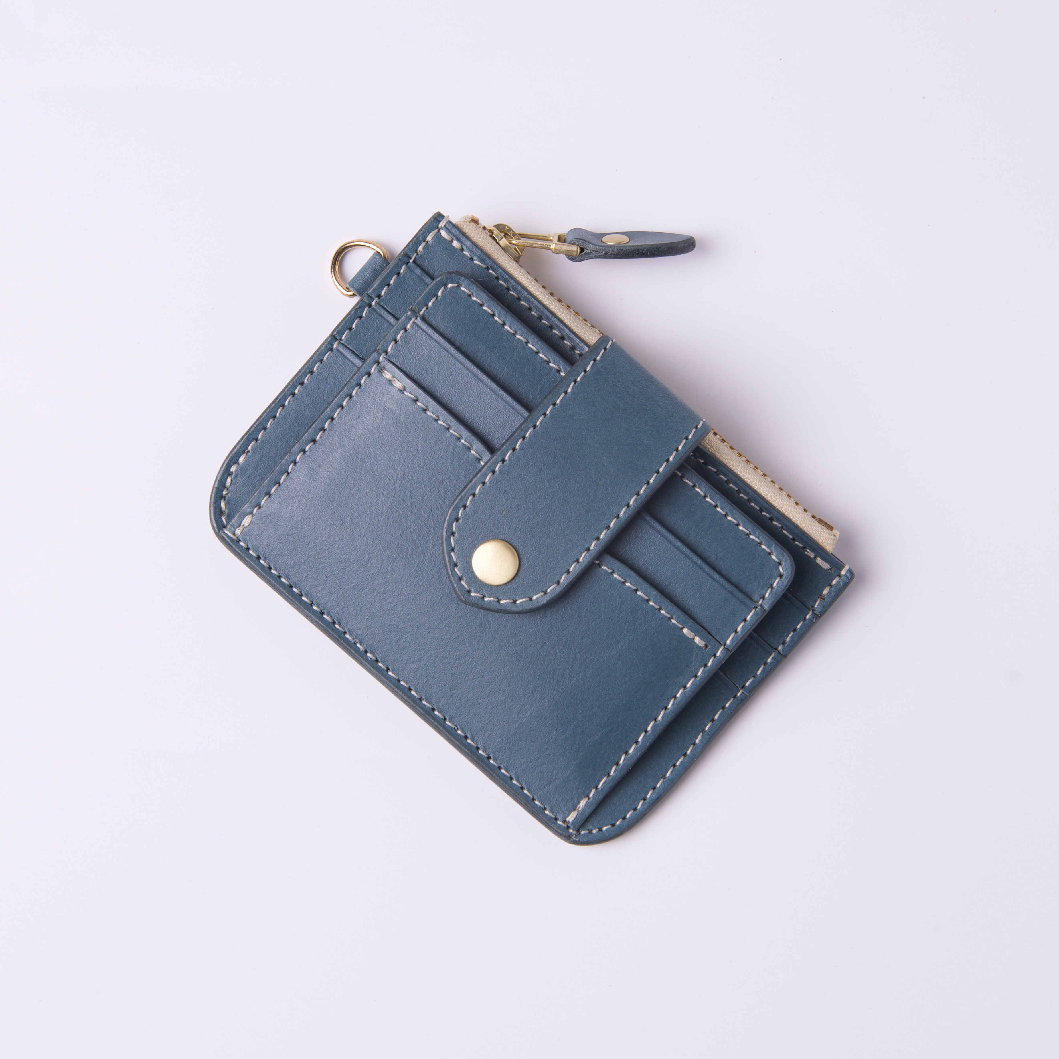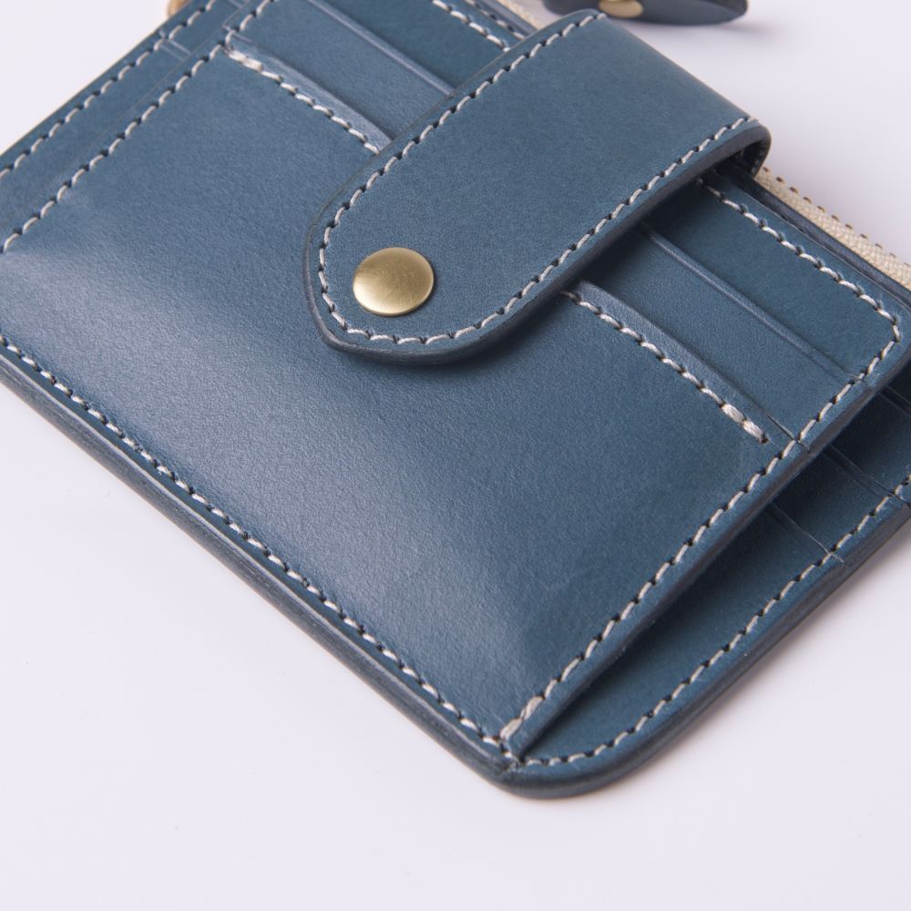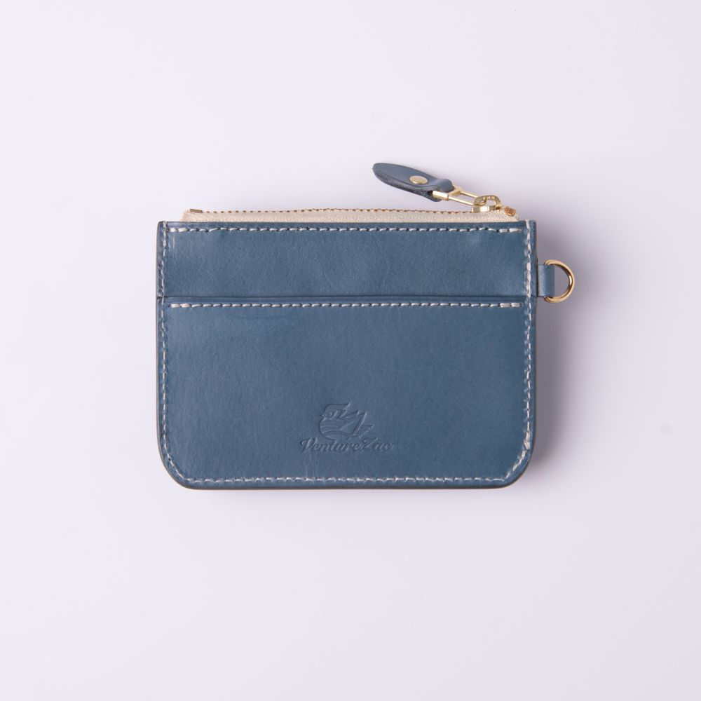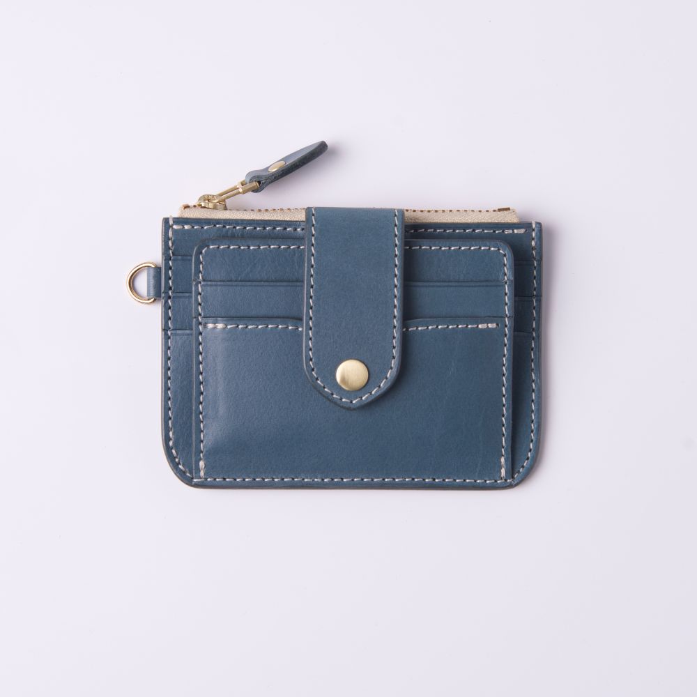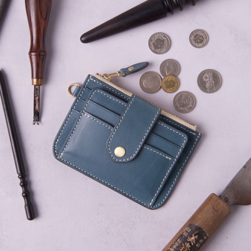 低飽和冷色調帶點霧灰度的莫蘭迪藍色植鞣革,給人高雅、精緻而低調的感覺,以純白縫線及黃銅金屬拉鍊做搭配,柔和視覺凸顯卡包線條相當合拍。