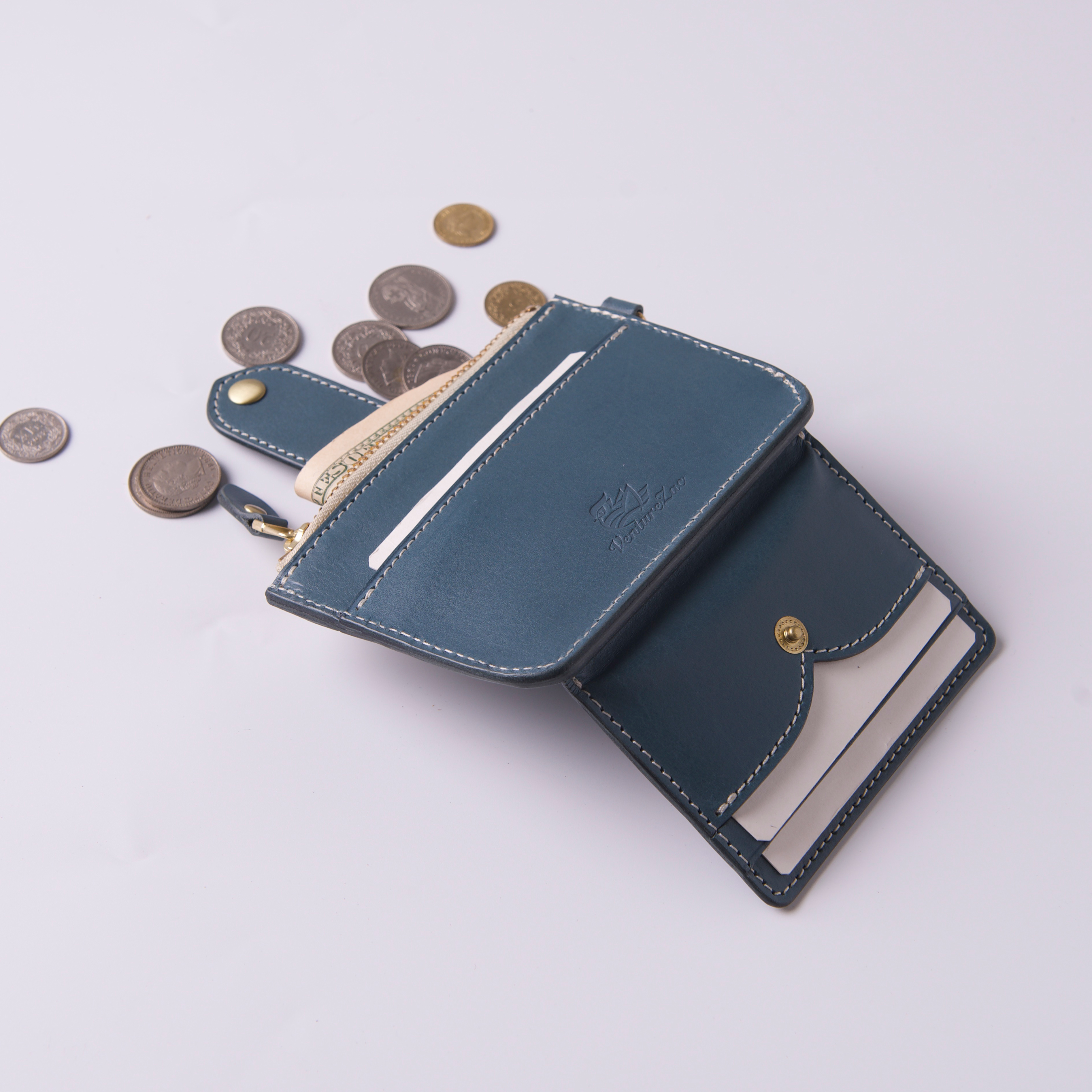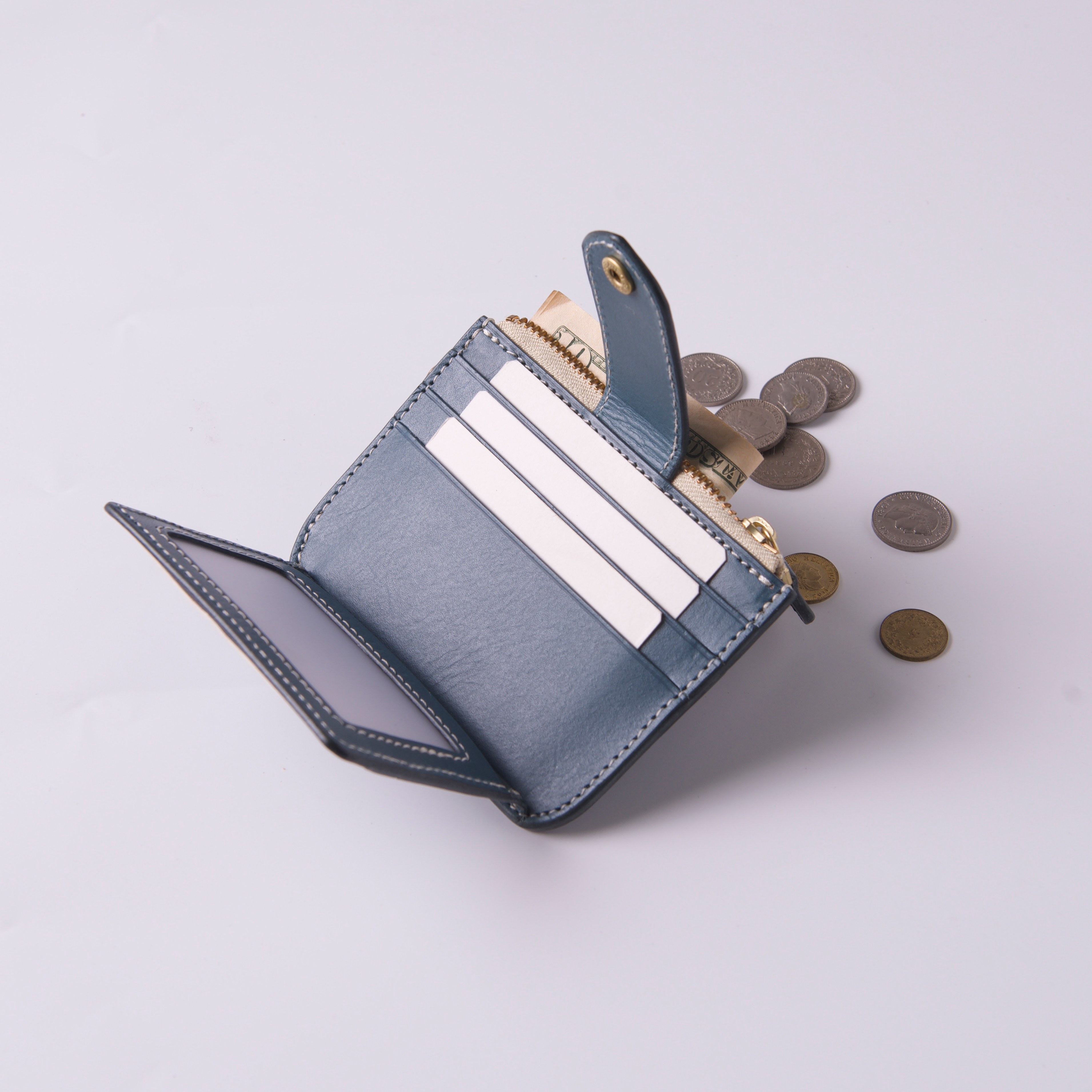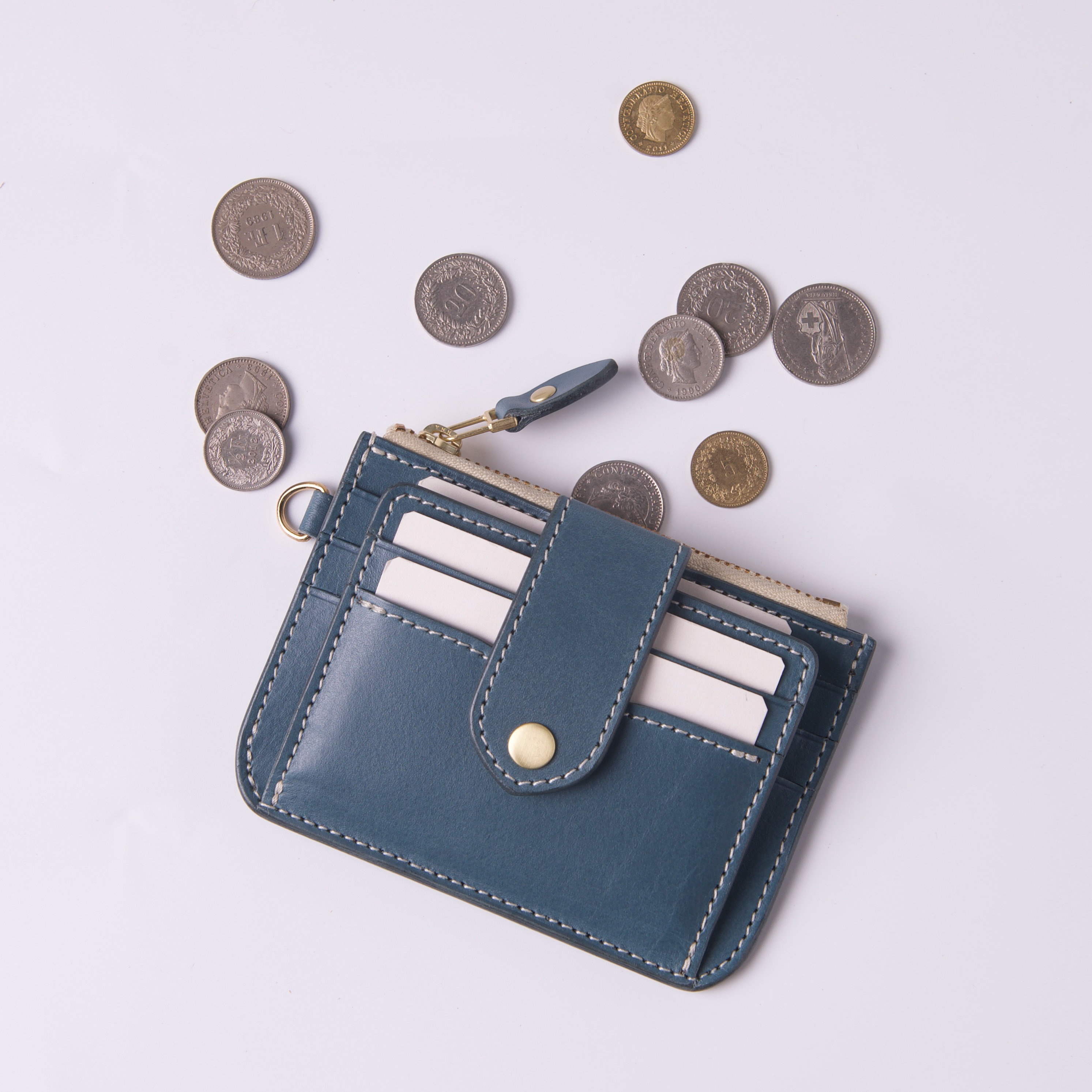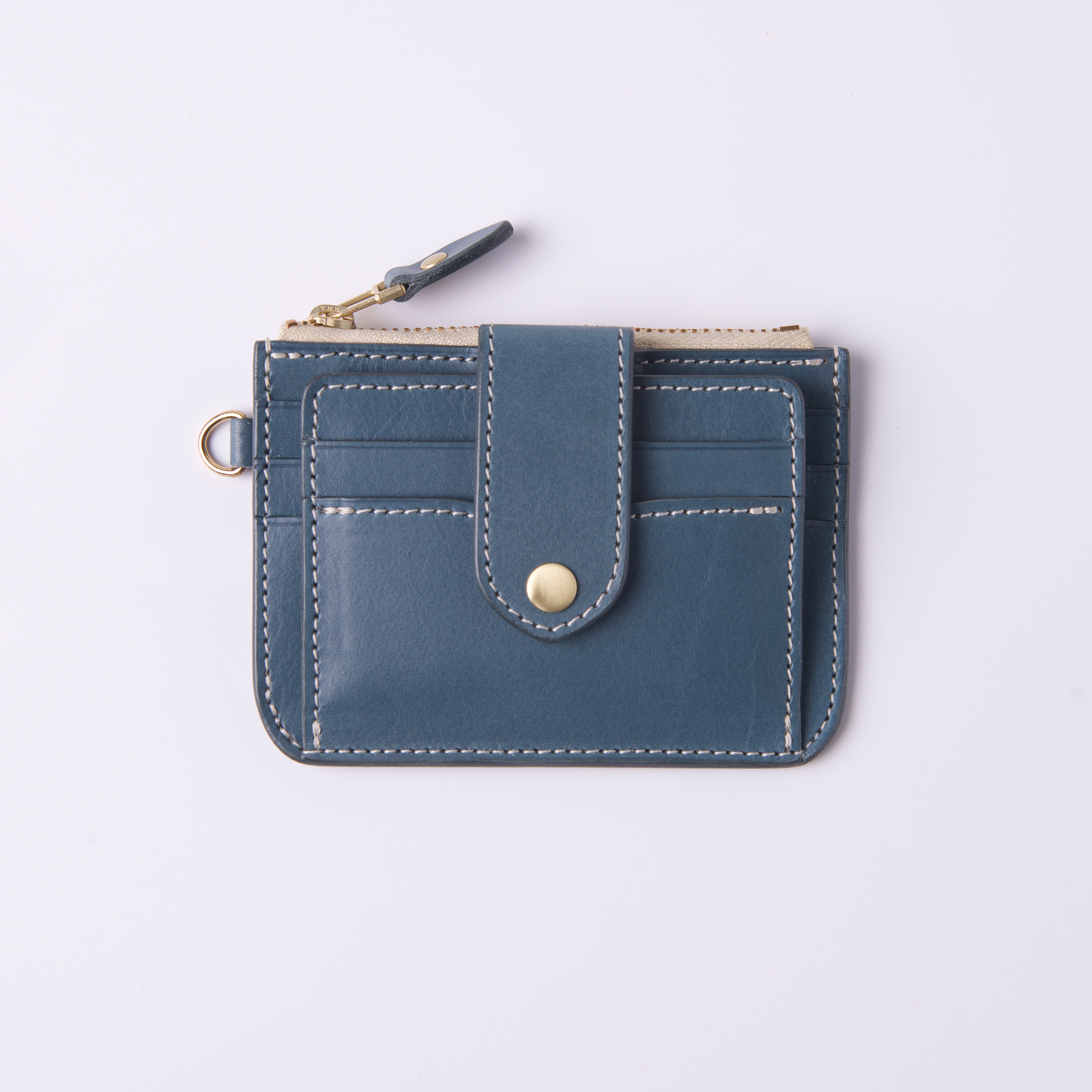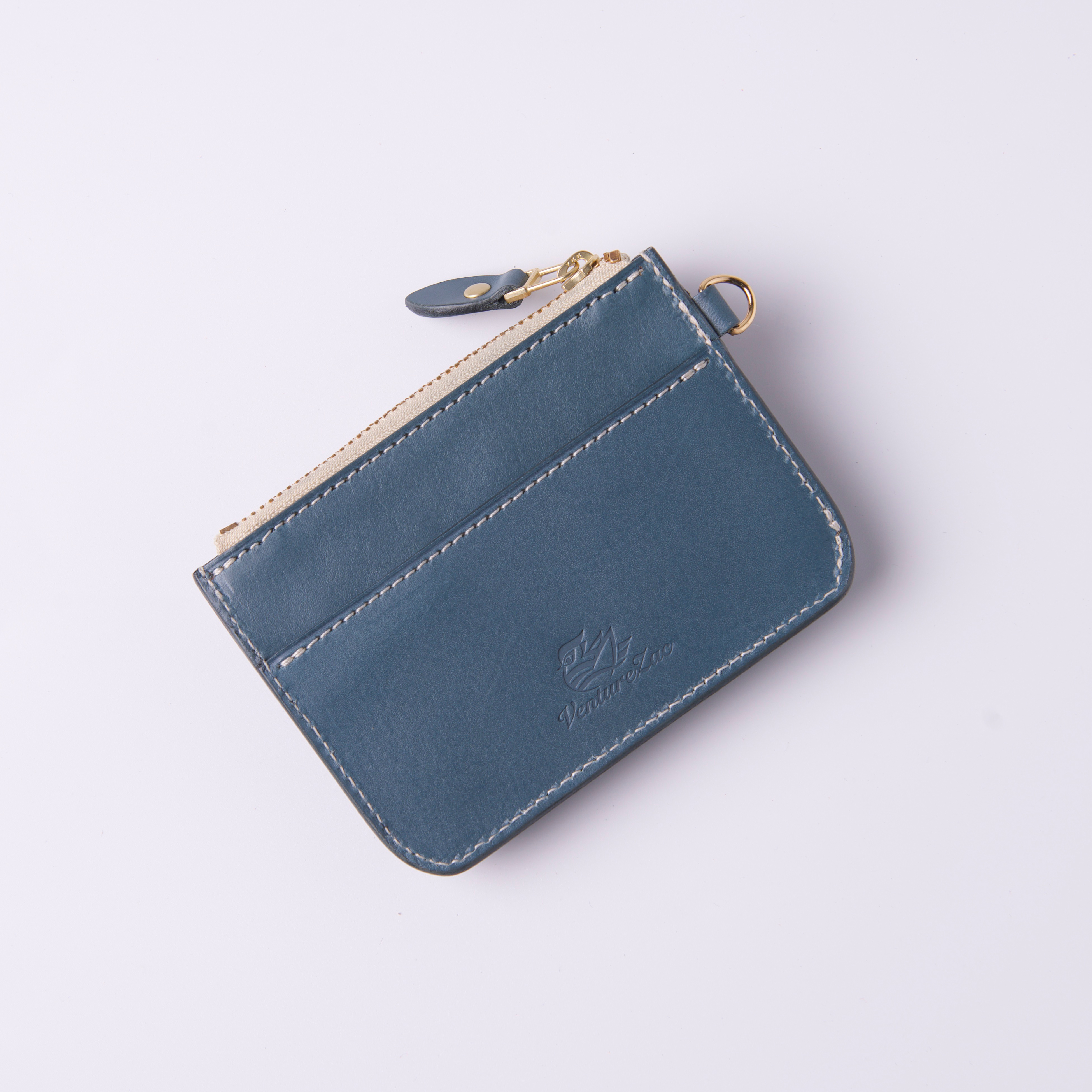 低飽和冷色調帶點霧灰度的莫蘭迪藍色植鞣革,給人高雅、精緻而低調的感覺,以純白縫線及黃銅金屬拉鍊做搭配,柔和視覺凸顯卡包線條相當合拍。