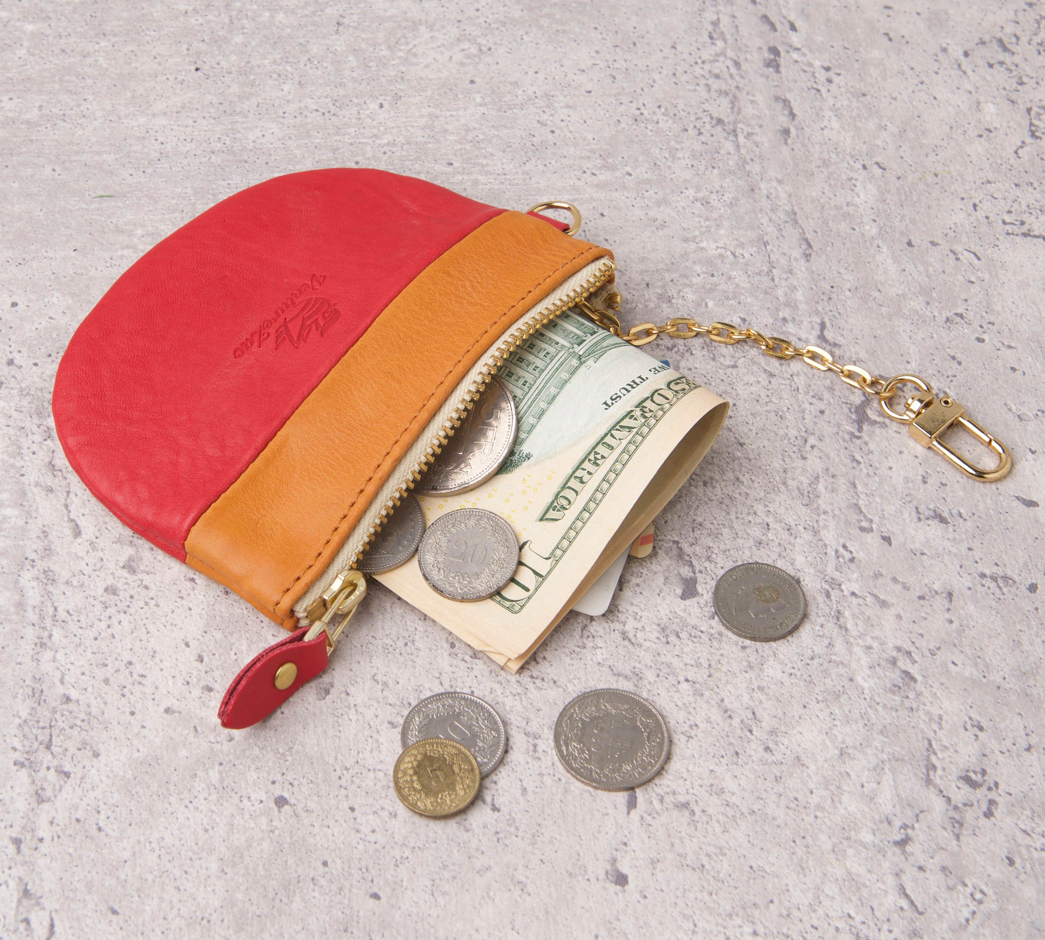 使用義大利摔軟植鞣牛革製作,手感柔軟Q彈!帶有鉤釦鏈的半圓小錢包不僅能收納卡片、零錢,鈔票也只需要對折一次就能輕鬆收入,有時一整串的鑰匙或者口紅、護唇膏也能擺放的恰到好處。